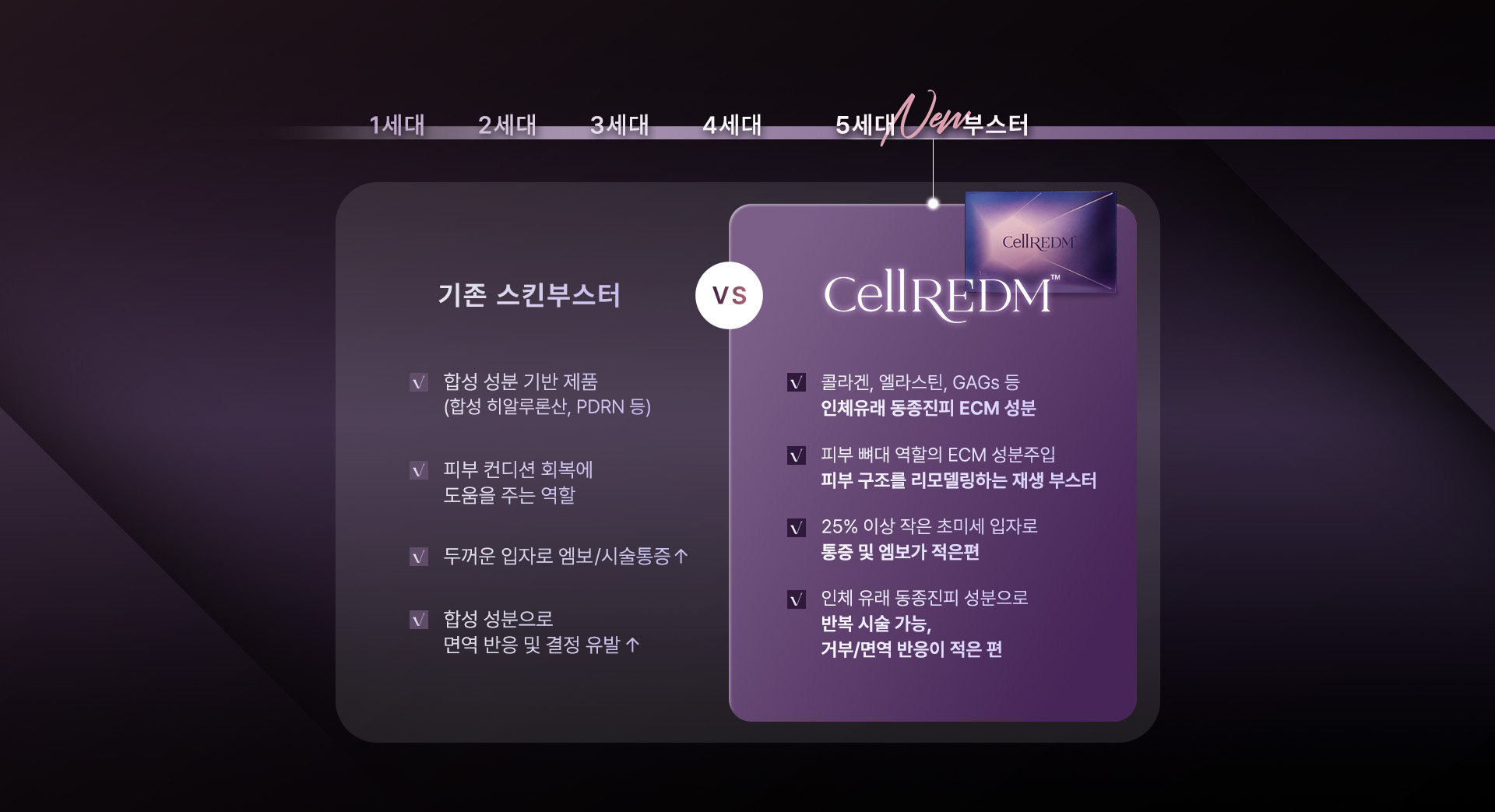 인체 피부에서 추출한 동종진피 ECM(세포외기질)을 피부에 직접 주입하는 5세대 스킨부스터입니다.