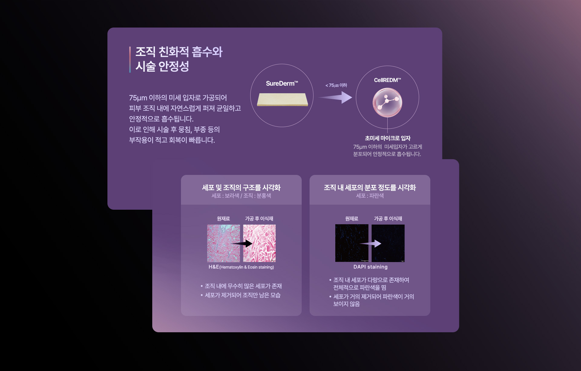 • 콜라겐, 엘라스틴, GAGs 등 인체유래 동종진피 ECM 성분